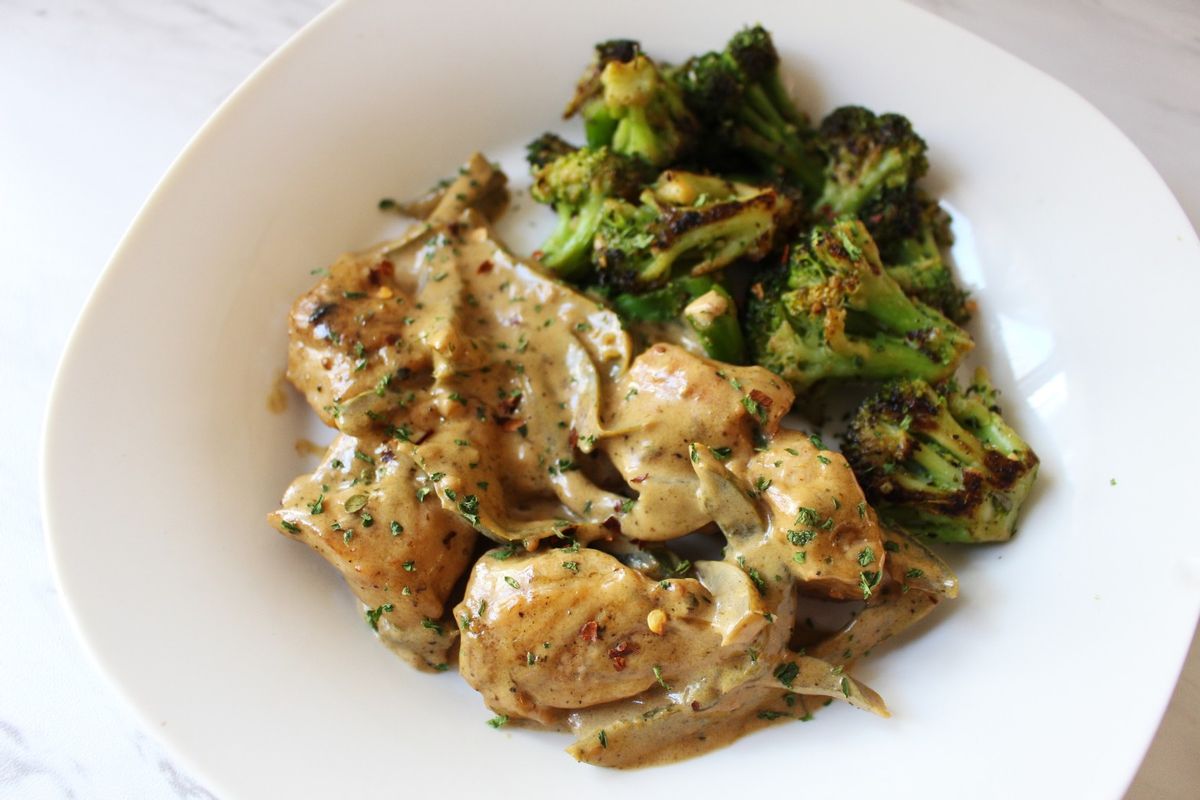 Traditional Scampi dishes include sliced peppers and onions with a little spice and white wine. This keto version uses low-carb green peppers, onion powder, crushed red pepper, and a dash of white wine vinegar. Paired with a bed of buttery broccoli, this recipe provides a full meal for your dinner or a meal prep.