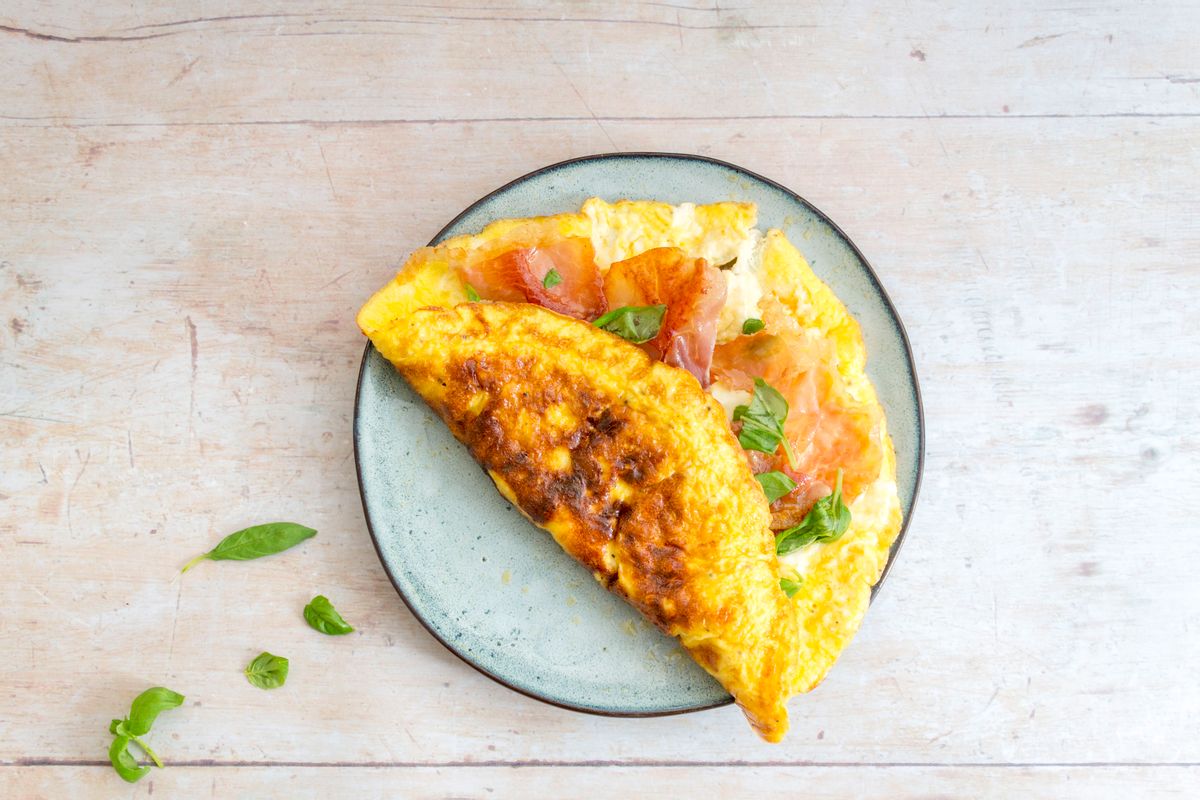Once the omelette is set and cooked through, carefully slide onto a plate and top one side with the crispy prosciutto and scatter over the fresh basil. Fold in half to serve.