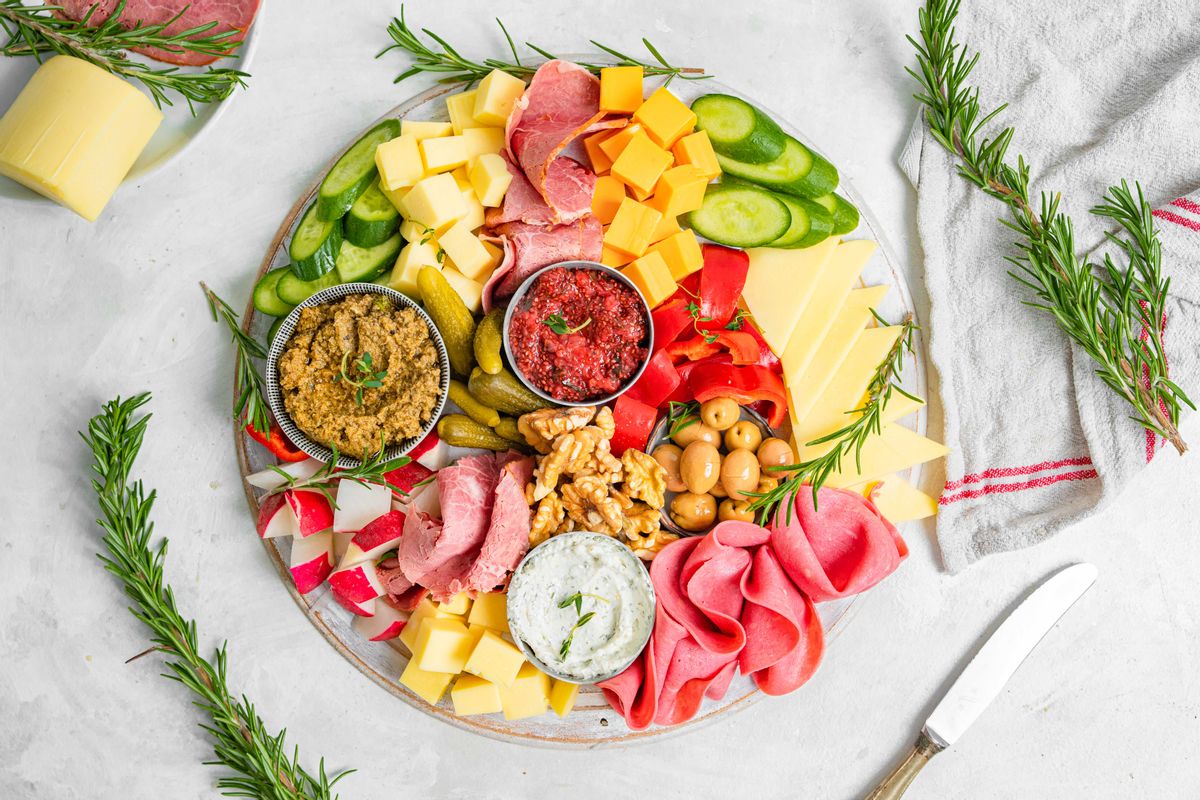 To assemble, arrange all the ingredients (meat, cheese, dips, nuts, pickles and olives) on a large serving board/platter. Make sure you arrange them according to color to make the board more inviting. Garnish with rosemary and thyme, and serve.