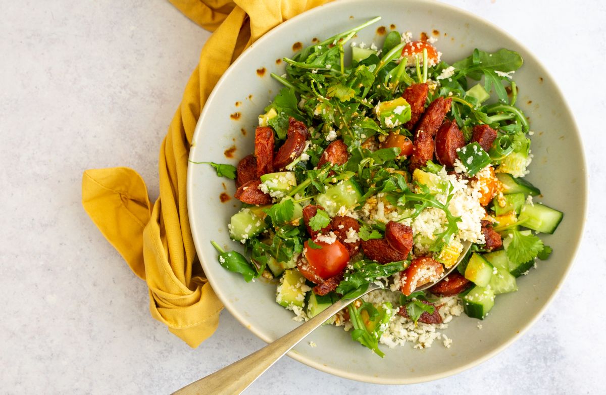 This tasty Keto salad recipe makes a delicious lunch or light dinner option. Our low carb dish is prepared with cauliflower rice, smoky Spanish chorizo, zesty lime juice, creamy avocado, juicy cherry tomatoes, cooling cucumber, fragrant fresh cilantro, and peppery arugula. The salad requires minimal cooking of the cauliflower and chorizo before being brought together and drizzled with a tangy chorizo oil dressing.