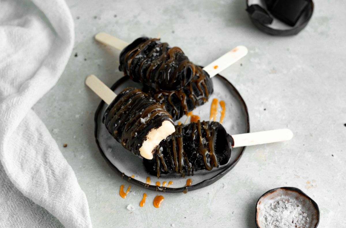 Once completely frozen, take the bars out of the freezer and drizzle with the remaining caramel sauce. Sprinkle with an optional pinch of flaked salt. Serve immediately, or store for later.