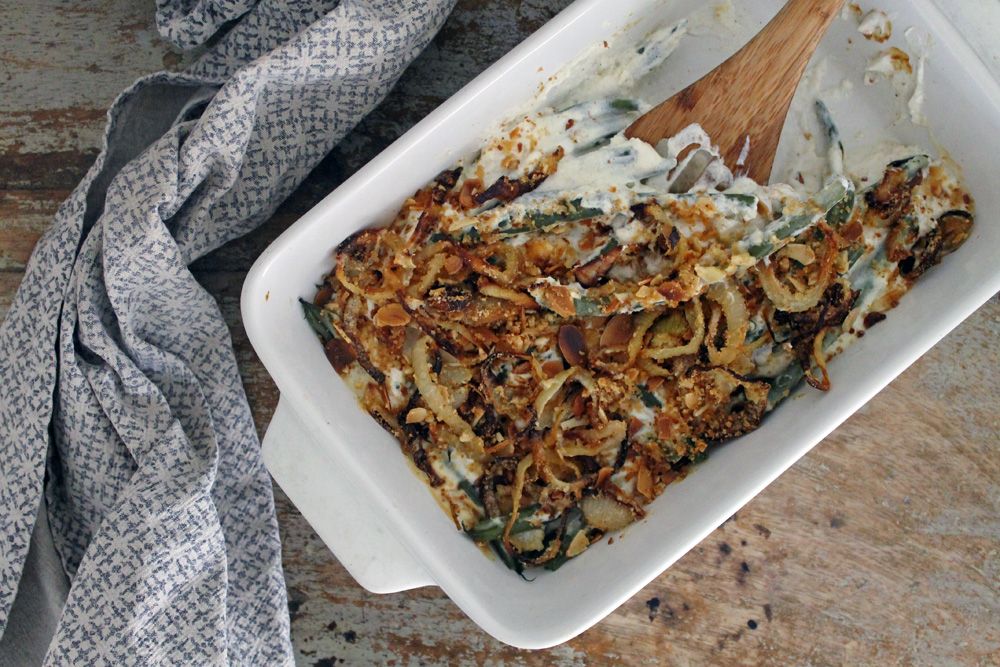 This deliciously rich green bean casserole is packed with both flavor and texture. From the soft creamy cheese, to the crisp salty onions and the crunch of almonds, this is a decadent side dish almost too good to share!
