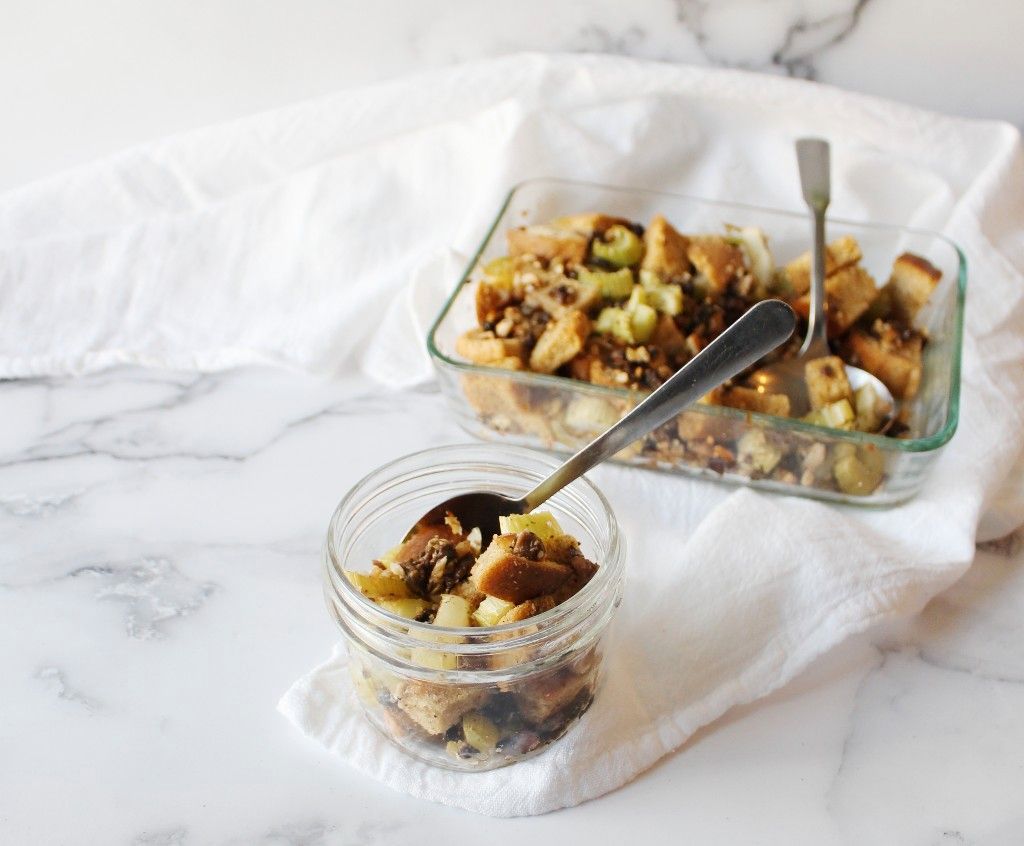 Dice fresh celery and cremini mushrooms and add them to the croutons in the mixing bowl. Chop the cashews into small pieces (you can toast them first if you’d like) and fold them into the stuffing mix, making sure there’s an even mix of diced ingredients and croutons. Next, spray a small baking dish with pan spray, then pour the stuffing into the dish. Use a spatula to pat the stuffing densely and fill every corner of the dish. Cut cold butter into small pieces and arrange them across the top of the stuffing.Step 4