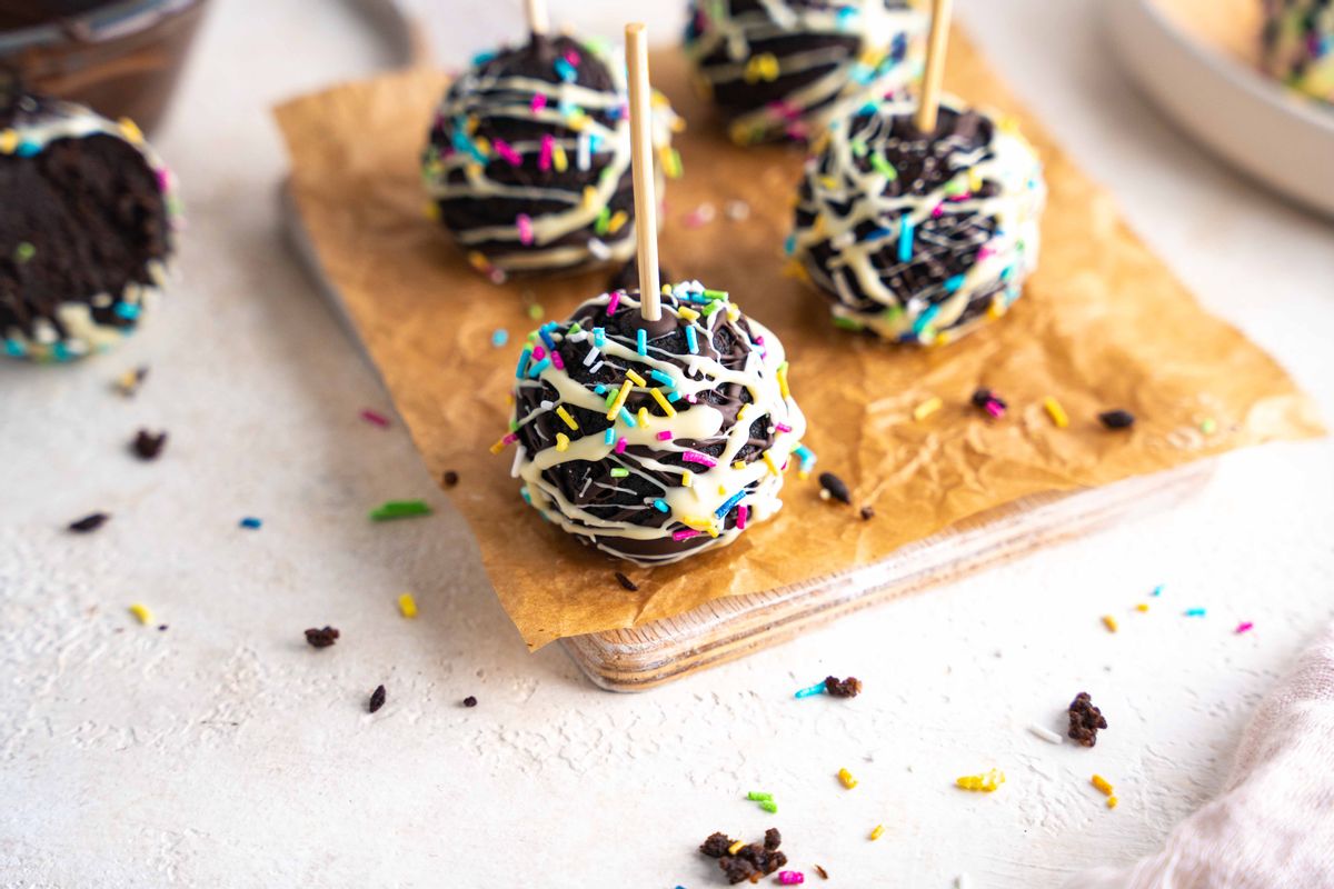 Using a fork, drizzle the dark chocolate over the cake pops. Once fully set, drizzle the white chocolate, then sprinkle some colorful sprinkles on the surface of the cake pops while the chocolate is still runny. Transfer the cake pops to the refrigerator to allow the chocolate to finish setting.Step 7