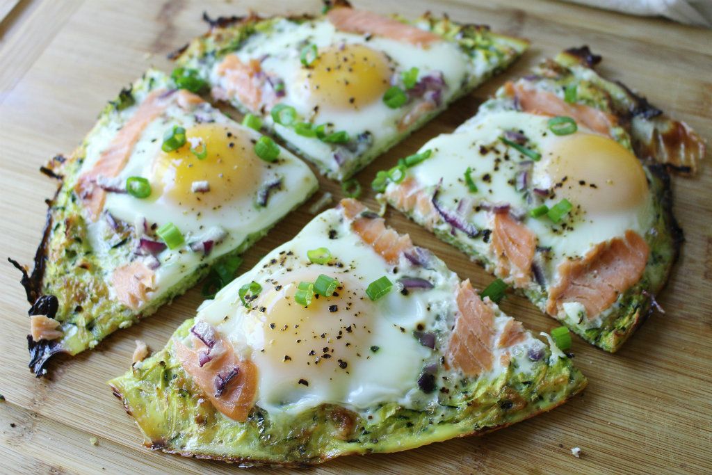 Forget the high-carb bagels that leave you hungry again in an hour! This lox breakfast pizza is far more satisfying and nutritionally dense to keep you full until lunch or snack time. A zucchini and parmesan pizza “crust” is loaded with strips of lox, eggs done to your liking, and a sprinkling of red onion. For a little more fat and flavor, you can add dollops of whipped cream cheese to your pizza slices at your discretion.