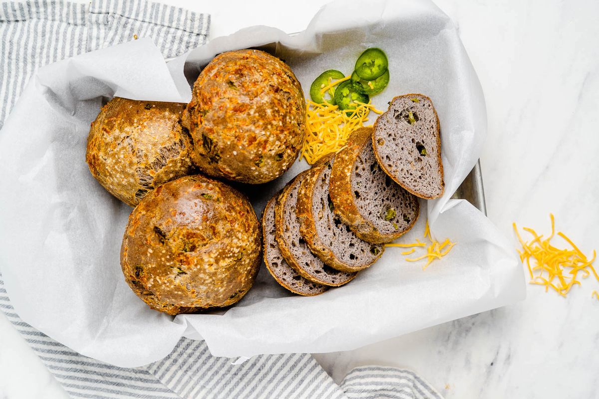 I love a spicy hamburger bun with chili and cheddar flavors. It pairs so well with a nice, thick, juicy hamburger. That is why I developed this recipe for Keto Jalapeno Cheddar Buns. High fiber dough envelopes shredded cheddar cheese and diced jalapenos. An egg wash is brushed on top prior to baking to give a nice shine and a way to adhere a delicious amount of salt. These buns are sturdy and perfect for slicing in half. The buns are also the perfect size for someone that is the only Keto person in their household because the buns can be sliced into rounds and spread with butter.