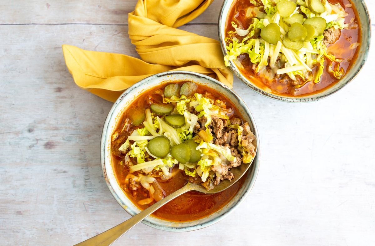 This Keto soup is a great way to enjoy all your favorite hamburger flavors and toppings - minus the carbs! Our low carb soup is prepared with ground beef, smoky paprika, cayenne pepper, tomato sauce, beef stock, aromatic garlic and onion and topped with shredded lettuce, gherkins and grated cheddar cheese. This makes a delicious low carb lunch or Keto dinner option.