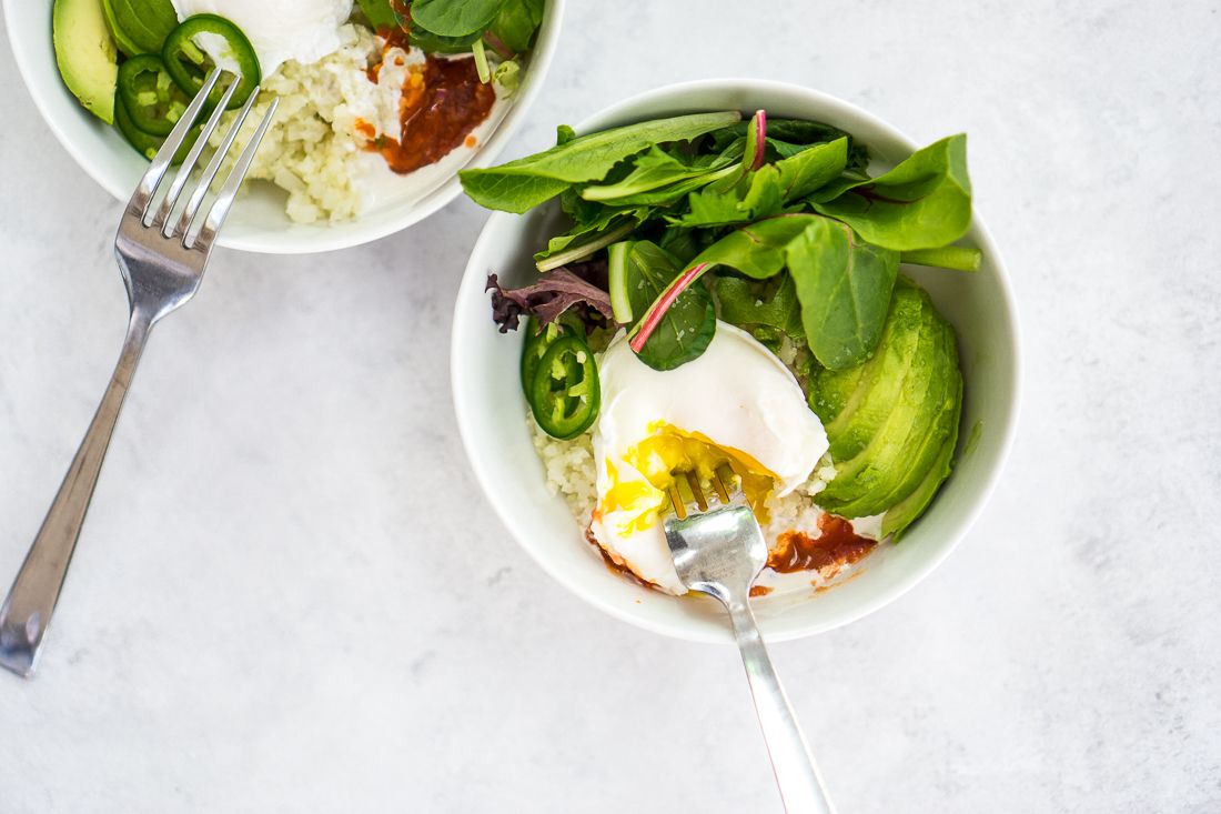 This is a delicious filling breakfast bowl that is full of flavor. Each bowl is filled with cauliflower rice, Mexican crema, salsa, hot sauce, spicy jalapenos, fresh mixed greens and a creamy poached egg. Feel free to add a squeeze of lime!