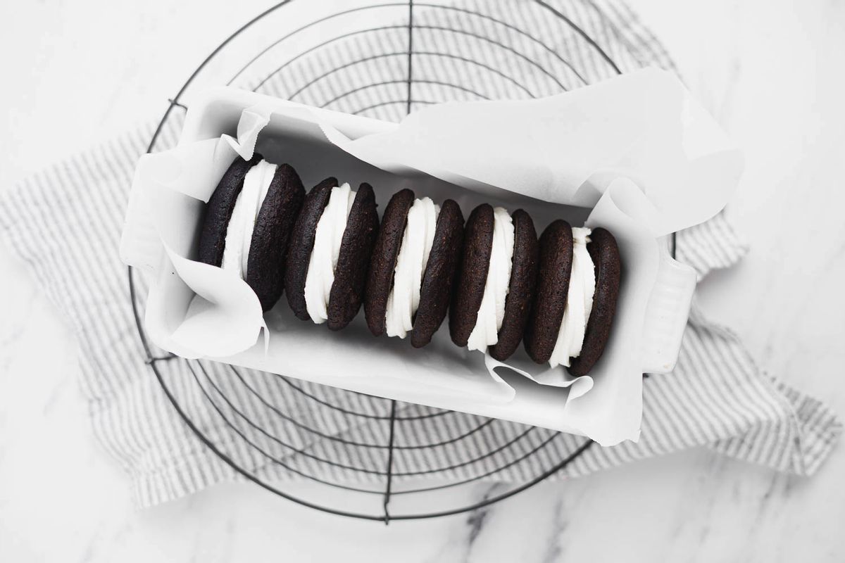 Fill a large piping tip fitted with a #825 Wilton tip with the buttercream. Pipe the buttercream in a swirl pattern on the cookie’s bottom, flat side to fill the entire surface. Top with another chocolate cookie with the flat side touching the buttercream. Repeat with the remaining cookies.