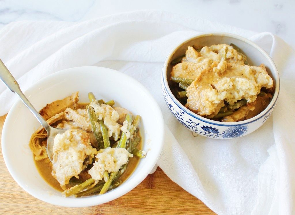 The dumplings in this Keto chicken recipe are made mostly with almond flour. Just almond milk and melted butter are added to form the dough for the dumplings. The dough just needs to chill in your refrigerator for a few minutes to absorb moisture and firm up a little. The dumplings have enough integrity to plop on top of your pan of chicken and green beans and cook until tender.