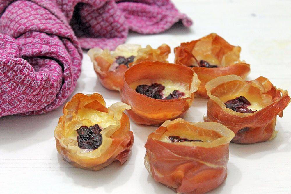 These prosciutto cups are a classic holiday flavour combination. Crispy baked prosciutto makes a great vessel for the brie and jam filling in place of a traditional pastry.