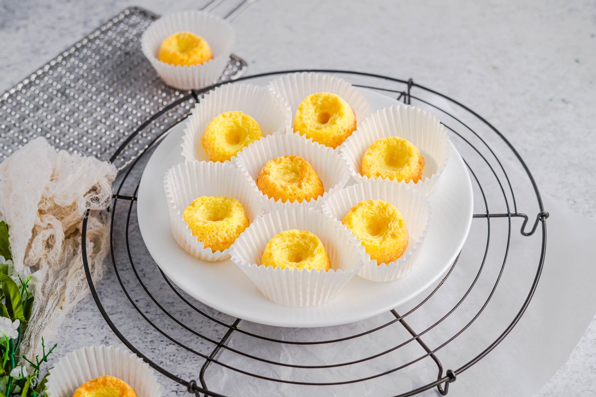 Grease a 12-count muffin tin with butter (or a non-dairy fat like coconut oil). Next, take a small cookie scoop and portion the quindim batter into the greased mini muffin tins. Bake the quindims for 12-15 minutes or until they are lightly golden but cooked through.Step 3