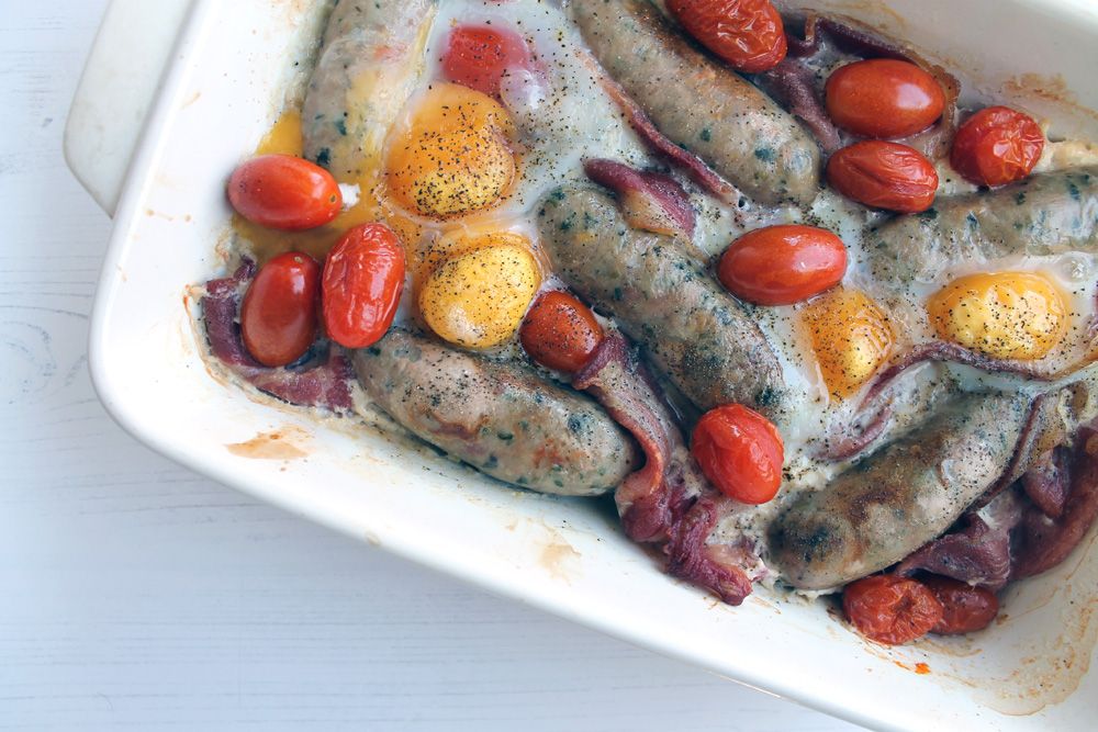 Remove the sausages from the oven and arrange the bacon and tomatoes roughly around the sausages. Return to the oven for a further 10 minutes.Step 4