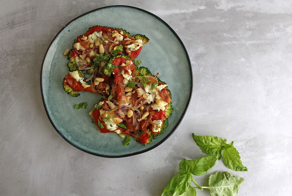Transfer the pizza topped broccoli to the oven for 8-10 minutes until the cheese is melted and the prosciutto is crisp and hot through. Scatter with pine nuts to serve.