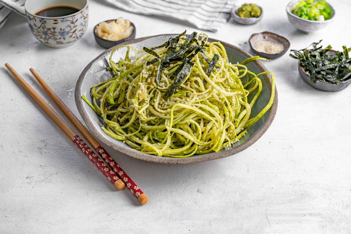 Cha soba noodles are a traditional Japanese dish popular for their green color and refreshing accompaniments. These noodles are dipped in a savory dipping sauce and complemented by ginger, scallions, nori, and other Asian ingredients. This Keto cha soba is prepared using zucchini noodles, infused in matcha, and paired with traditional Japanese ingredients for a full experience.
