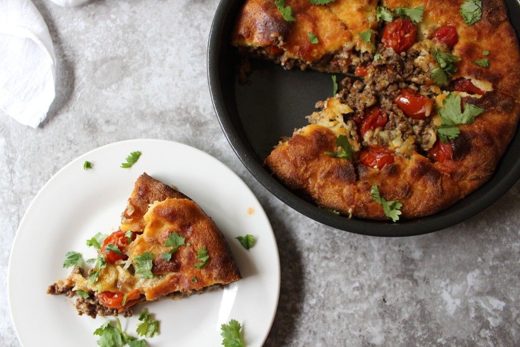 Sprinkle half the mozzarella cheese in the bottom of the dough in the pie pan. Transfer all the enchilada beef into the dish. Then, arrange whole grape tomatoes on top of the beef, pressing them down gently.Step 6